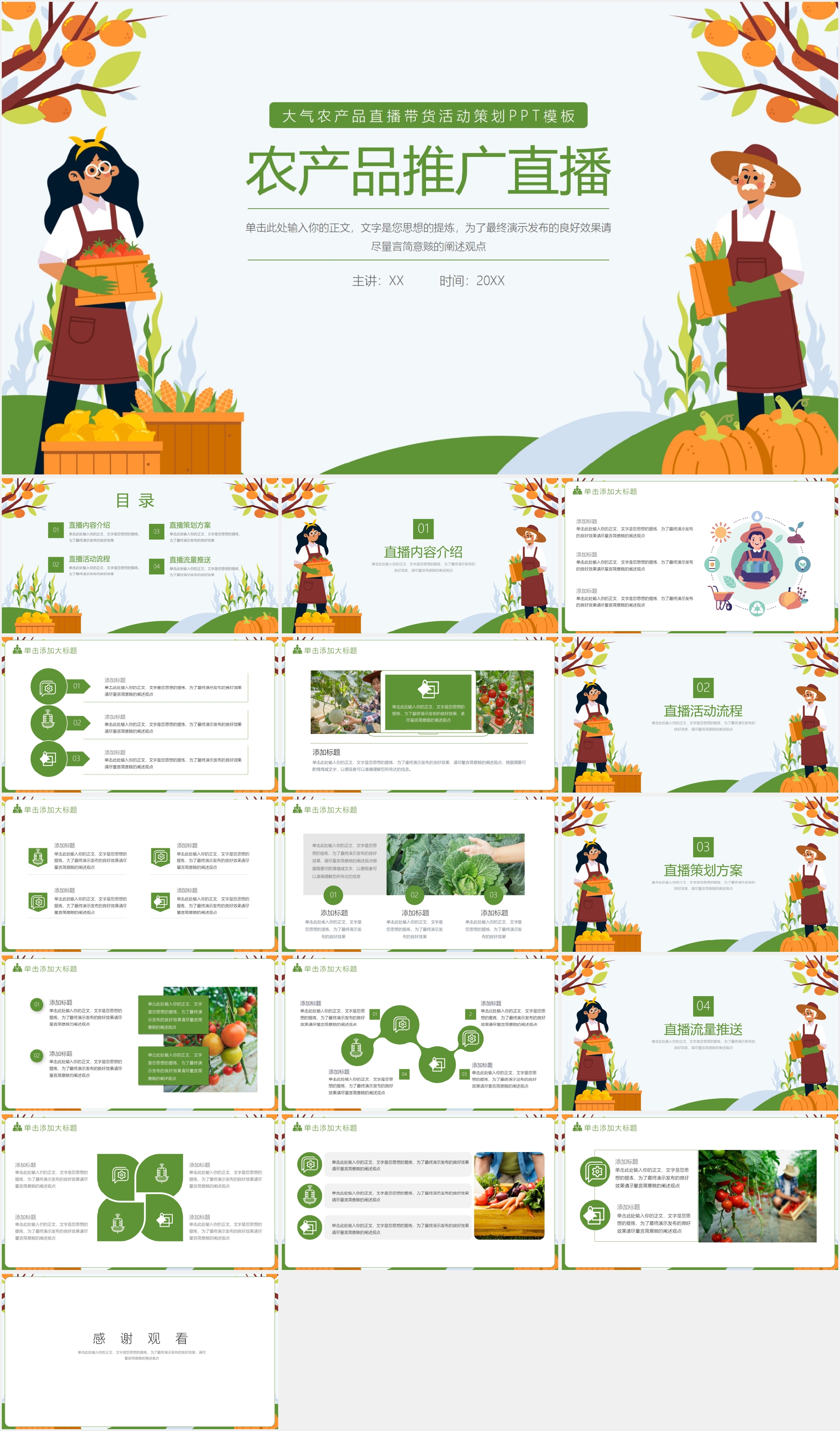 本作品内容为清新绿色农产品介绍PPT模板, 格式为 pptx, 大小18 MB, 页数为23,比例16:9, 请使用软件PowerPoint(2016)打开, 作品中主体文字及图片可替换修改,文字修改可直接点击文本框进行编辑,图片更改可选中图片后单击鼠标右键选择更换图片,也可根据自身需求增加和删除作品中的内容, 源文件无水印, 欢迎使用熊猫办公。 如认为平台内容涉嫌侵权,可通过邮件:tousu@zdlhp.com提出书面通知,我们将及时处理。